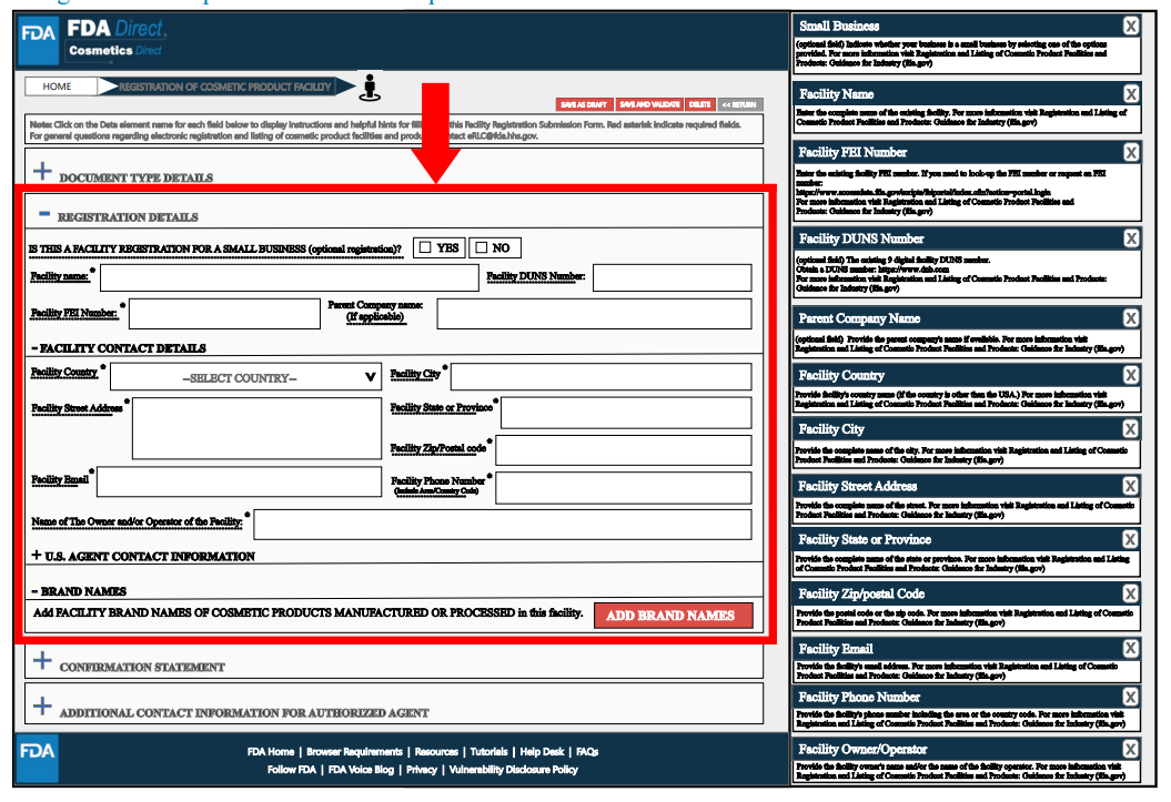 在Registration Details处,红色框中标星号的是必填项,包括工厂名称、FEI号(属于豁免注册的工厂且没有FEI号,可以提供企业名称和地址)、工厂联系信息。