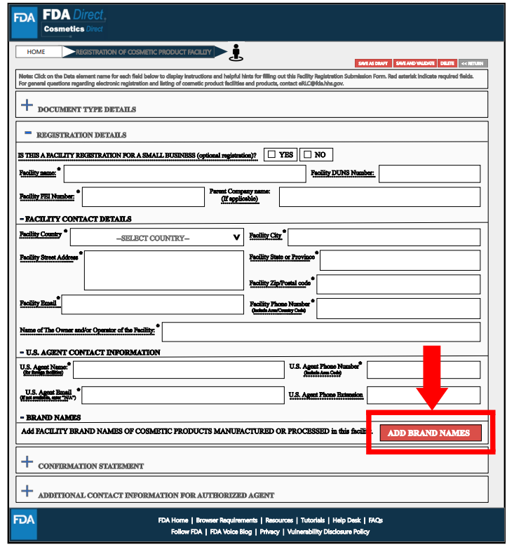 在Brand Name(s)处,通过选择“添加品牌名称”提交在该工厂生产或加工的化妆品品牌名称,并选择适用于此品牌名称的所有类别代码。可以提交多个品牌信息。
