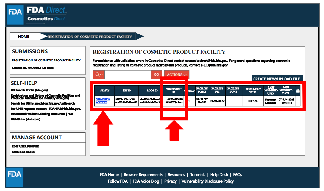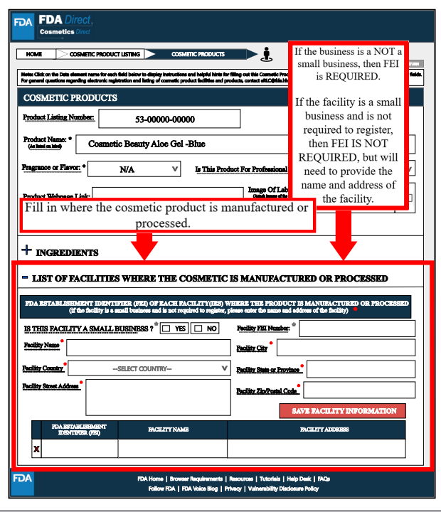 List of Facility处,需要填写生产或加工化妆品产品的工厂信息,此处也需要填写FEI号,其要求与设施注册中的一致。