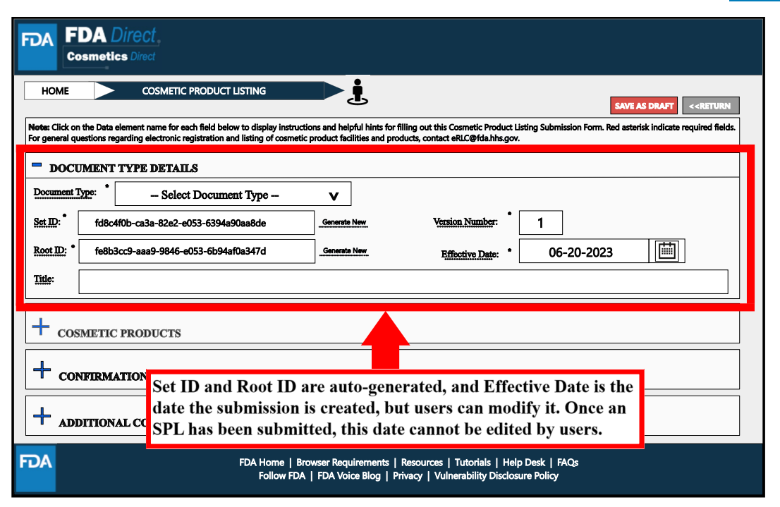 Document Type Details处,Document Type是指产品清单登记类型;Set ID、Root ID以及生效日期与设施注册中的解释一致。