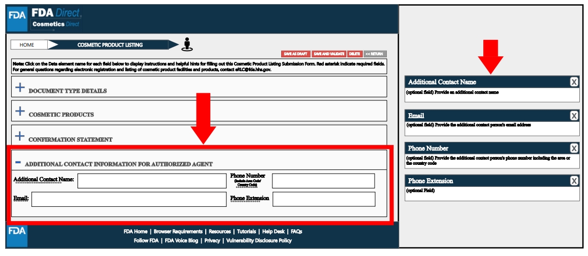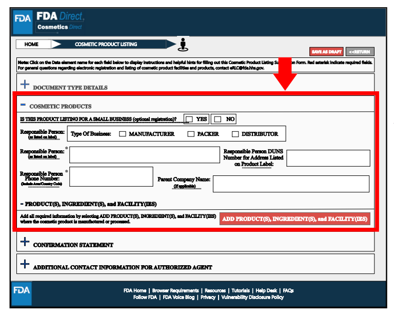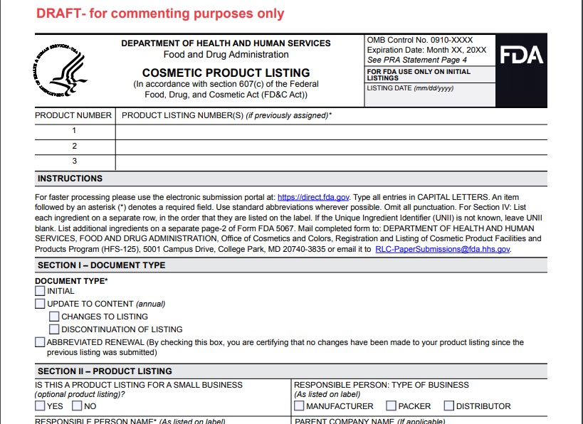 - 产品清单登记:责任人必须向FDA登记每种上市的化妆品,包括产品成分,并且每年进行相关更新。上述的责任人是指名称出现在化妆品标签上的制造商、包装商或分销商。