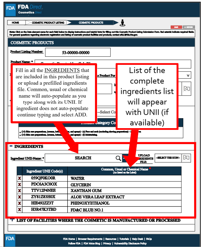 INGREDIENTS处,需要填写清单中产品的所有成分信息,包括原料的名称(按照美国的原料命名规则,可参考CIRS解读“美国对化妆品用原料的管理”)以及UNII编号,但不需要填写配方中原料使用的浓度信息。原料信息可通过文件上传,但暂未说明文件格式要求。