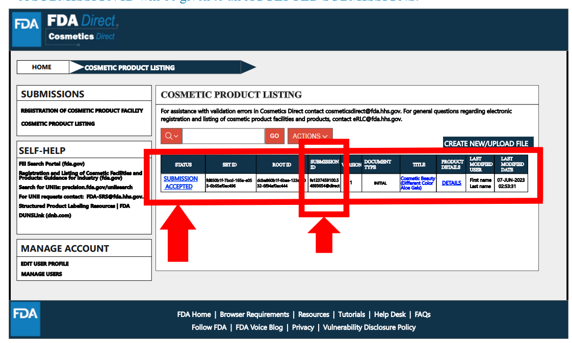 在完成产品清单登记流程后,状态将变为“提交已接受”,并分配一个产品清单登记的ID。