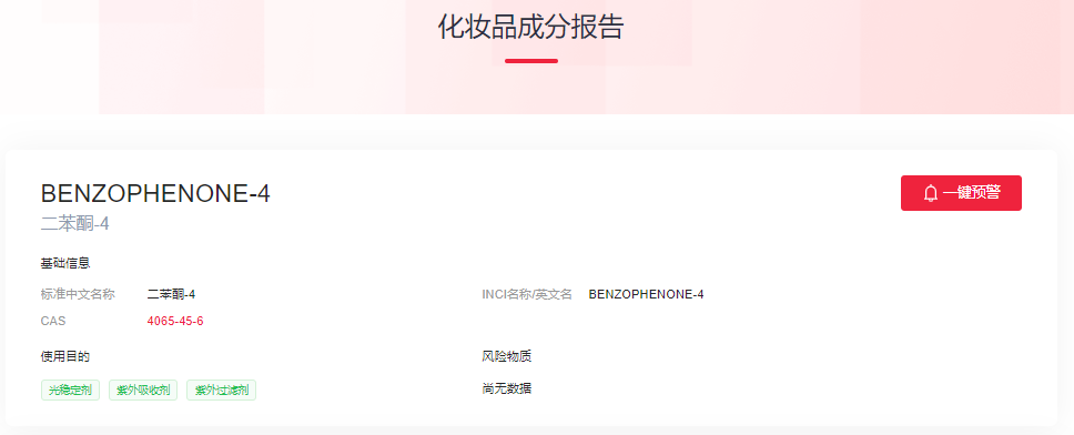 根据安全评估,并考虑到苯酮-4潜在的内分泌干扰特性所引起的关注,消费者安全科学委员会(SCCS)认为,苯酮-4作为紫外线过滤剂,在防晒霜、面霜和护手霜、口红、防晒喷雾剂和泵式喷雾中的使用浓度最高可达5%,无论是单独使用还是混合使用(基于确定性的综合暴露评估),都是安全的。