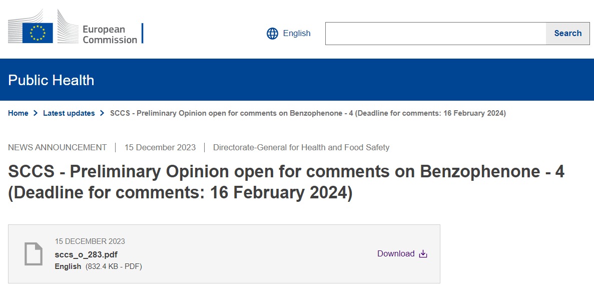 2023年12月15日,欧盟消费者安全科学委员会(SCCS)发布关于征求二苯酮-4(Benzophenone-4, CAS No. 4065-45-6, EC No. 223-772-2)的初步意见(SCCS/1660/23)。公开征求意见时间截止至2024年2月16日。