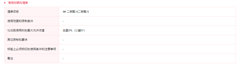 由瑞旭集团自主研发的中国化妆品原料法规数据库(妆合规)查询信息显示:二苯酮-4在化妆品中用作光稳定剂、紫外吸收剂、紫外过滤剂,已纳入中国《已使用化妆品原料目录》(2021版),列入《化妆品安全技术规范》的准用防晒剂清单,用作防晒剂时二苯酮-4和二苯酮-5的最高允许使用浓度总量为5%(以酸计)。