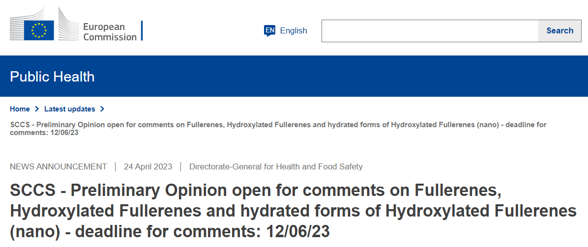 2023年4月24日,欧盟消费者安全科学委员会(SCCS)发布关于富勒烯(Fullerenes)、羟基化富勒烯(Hydroxylated Fullerenes)和水合形式的羟基化富勒烯(hydrated forms of Hydroxylated Fullerenes)(纳米)的初步意见(SCCS/1649/23)。公开征求意见截止日期:2023年6月12日。