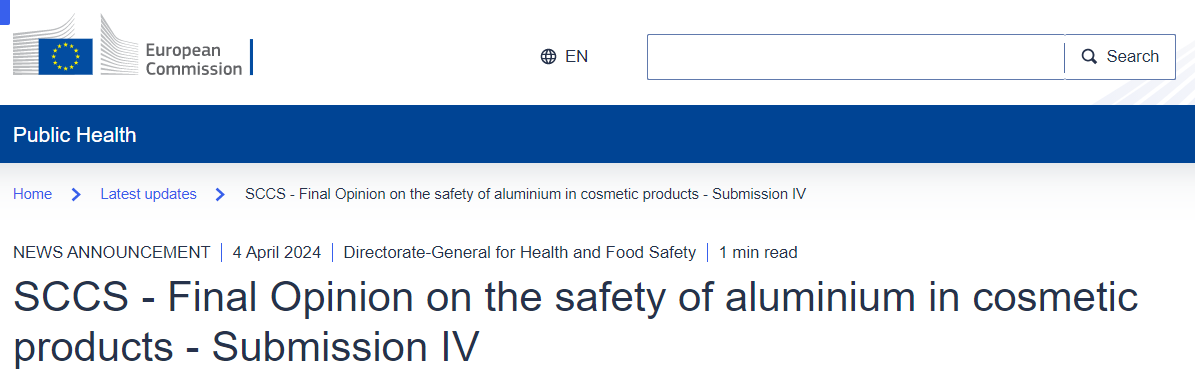 2024年4月4日,欧盟消费者安全科学委员会(SCCS)发布关于铝(Aluminium)的最终意见(SCCS/1662/23)。初步意见发布于2023年12月14日。