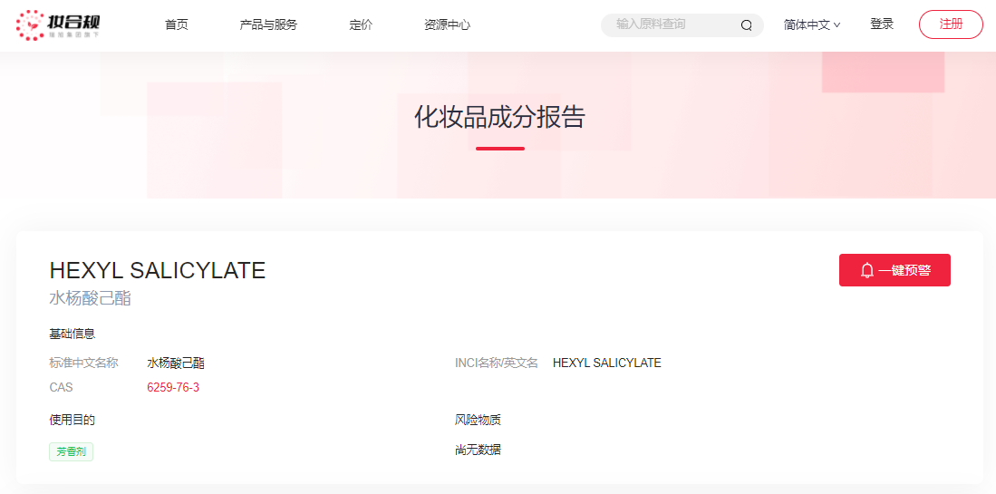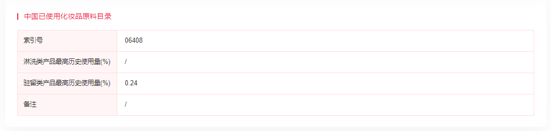 由瑞旭集团自主研发的中国化妆品原料法规数据库(妆合规)查询信息显示:水杨酸己酯已纳入中国已使用化妆品原料目录,且驻留类产品最高历史使用量为0.24%。