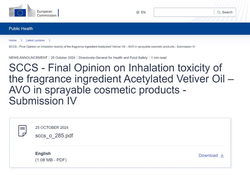 2024年10月25日,欧盟消费者安全科学委员会(SCCS)发布关于香精成分乙酰基岩兰草油Acetylated Vetiver Oil(AVO)(CAS No.84082-84-8, EC No.282-031-1)在喷雾型化妆品中吸入毒性的最终意见(SCCS/1163/24),其初步意见发布于2024年3月5日。