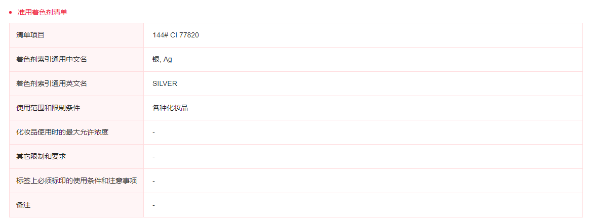 由瑞旭集团自主研发的中国化妆品原料法规数据库(妆合规)查询信息显示:银在化妆品中用作着色剂,已纳入中国《已使用化妆品原料目录》(2021版),列入《化妆品安全技术规范》的准用着色剂清单。