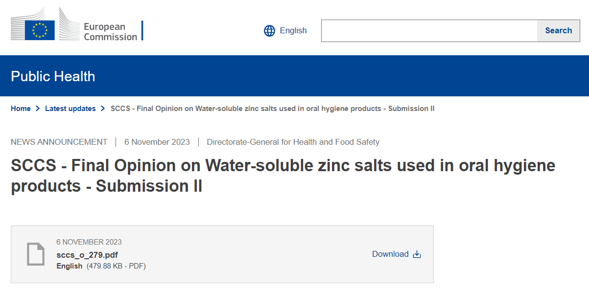 2023年11月6日,欧盟消费者安全科学委员会(SCCS)发布关于用于口腔卫生产品的水溶性锌盐(water-soluble zinc salts)的最终安全意见(SCCS/1657/23)。关于用于口腔卫生产品的水溶性锌盐的初步意见发布于2023年7月4日。