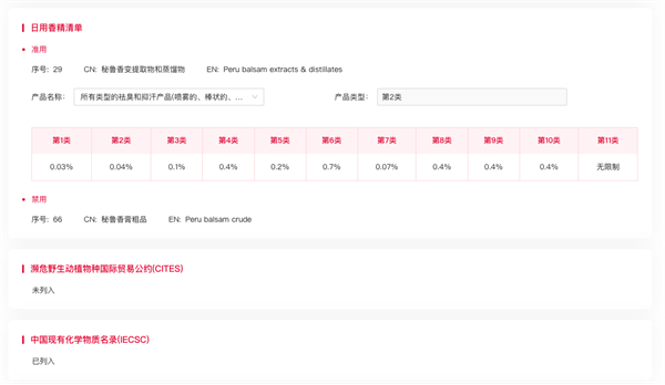 那么如何去查国家标准规定的各类日用香精在不同类别日化产品中的最高使用限量呢? 我们依据我国相关(香精)国家标准《日用香精》(GB/T 22731-2017),对妆合规中国化妆品原料法规数据库(China CosIng 2.0)进行了重大升级,新增日用香精查询功能,支持一键查询日用香精准用清单和禁用清单、以及日用香精中限用的香料在11类加香化妆品中的最高限量。