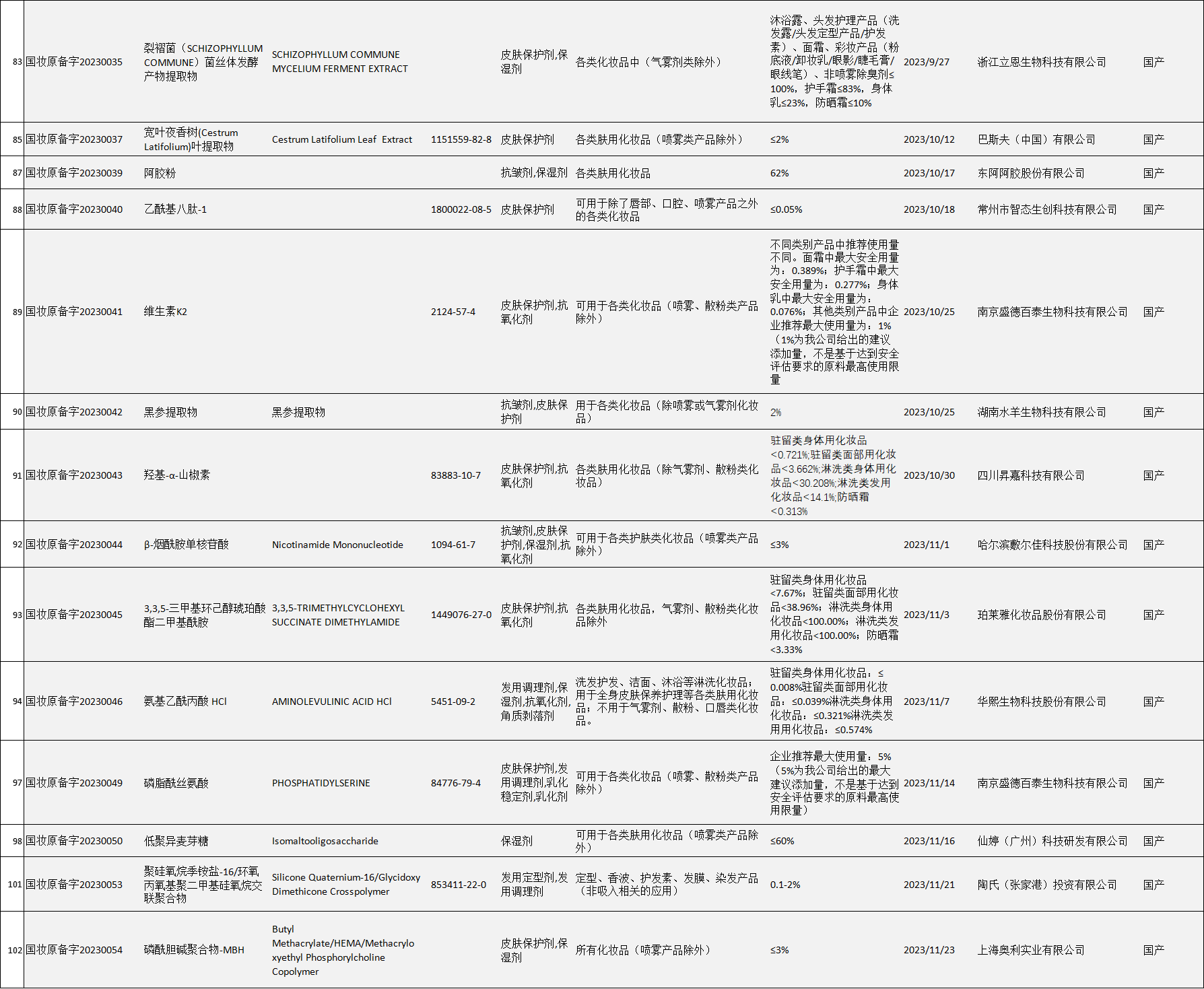 表1 新法规下2023年获得备案的国产化妆品新原料信息