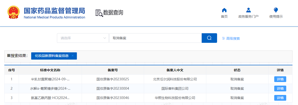 2024年9月13日,继5款新原料注销后,又有三款新原料取消备案,分别是半乳甘露聚糖(国妆原备字20230025)、水解α-葡聚糖多糖(国妆原备字20230004)、氨基乙酰丙酸HCl(国妆原备字20230046)。