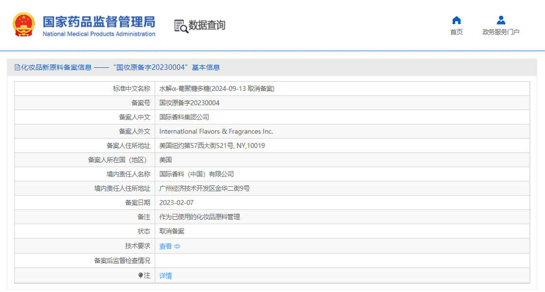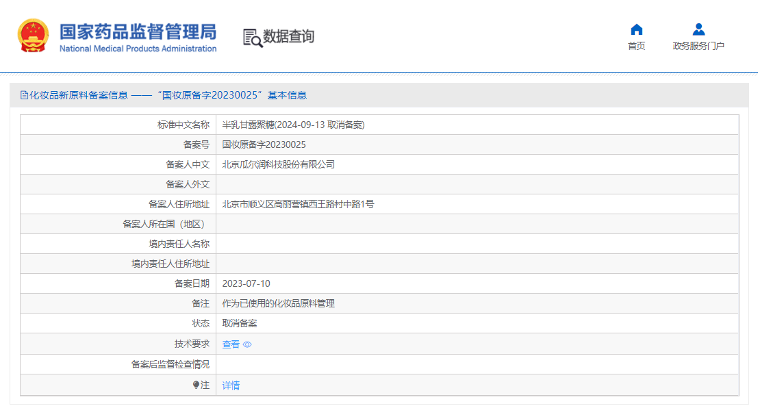 根据国家药品监督管理局,半乳甘露聚糖(国妆原备字20230025)、水解α-葡聚糖多糖(国妆原备字20230004)被取消备案的原因是“作为已使用的化妆品原料管理”。