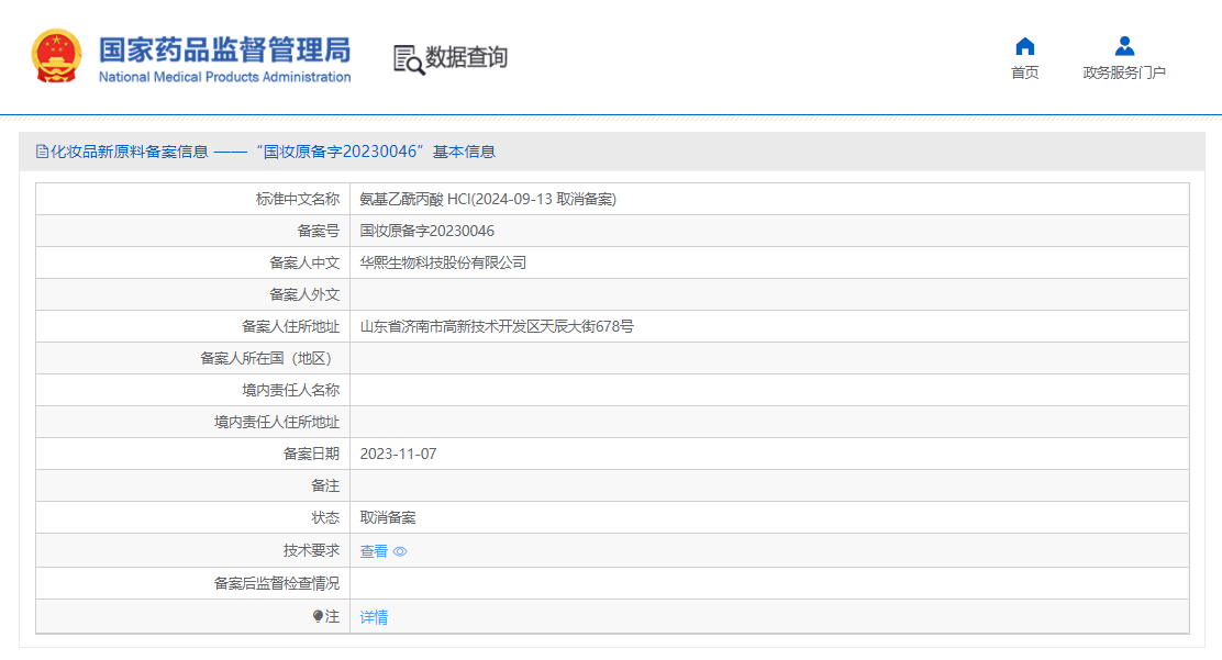氨基乙酰丙酸HCl(国妆原备字20230046)被取消备案的原因不详。
