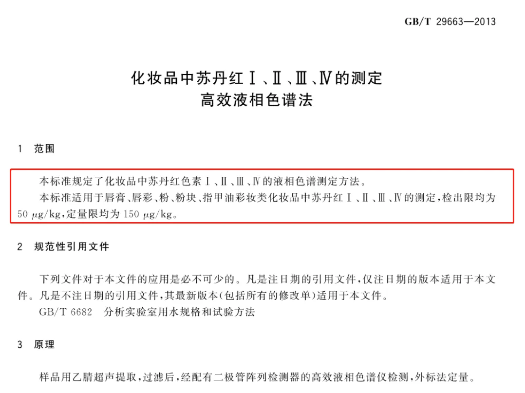 据青眼了解,当前化妆品行业有关苏丹红的国家检测标准主要为2013年出台的《化妆品中苏丹红Ⅰ、Ⅱ、Ⅲ、Ⅳ的测定高效液相色谱法》(下称:《苏丹红测定方法》),而该方法主要针对于彩妆产品的检测。