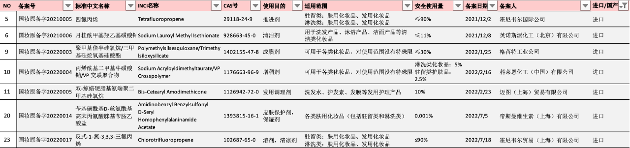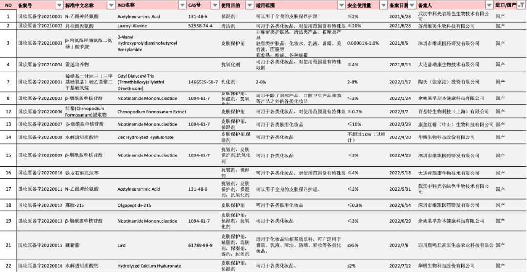在旧法规《化妆品卫生监督管理条例》下,从2004年至2021年5月1日前,一共批准了14个新原料。2021年5月1日起,新规下的化妆品新原料注册备案需在国家药品监督管理局网上办事大厅的化妆品智慧申报审评系统中进行申请。自2021年5月1日至2022年7月22日期间,共有23个化妆品新原料通过备案。其中16个属于国产化妆品新原料,7个属于进口化妆品新原料。2021年12月,瑞旭集团协助企业获得首个和第二个进口化妆品新原料备案号。2022年7月,瑞旭集团协助企业又成功获得一个进口化妆品新原料备案号。