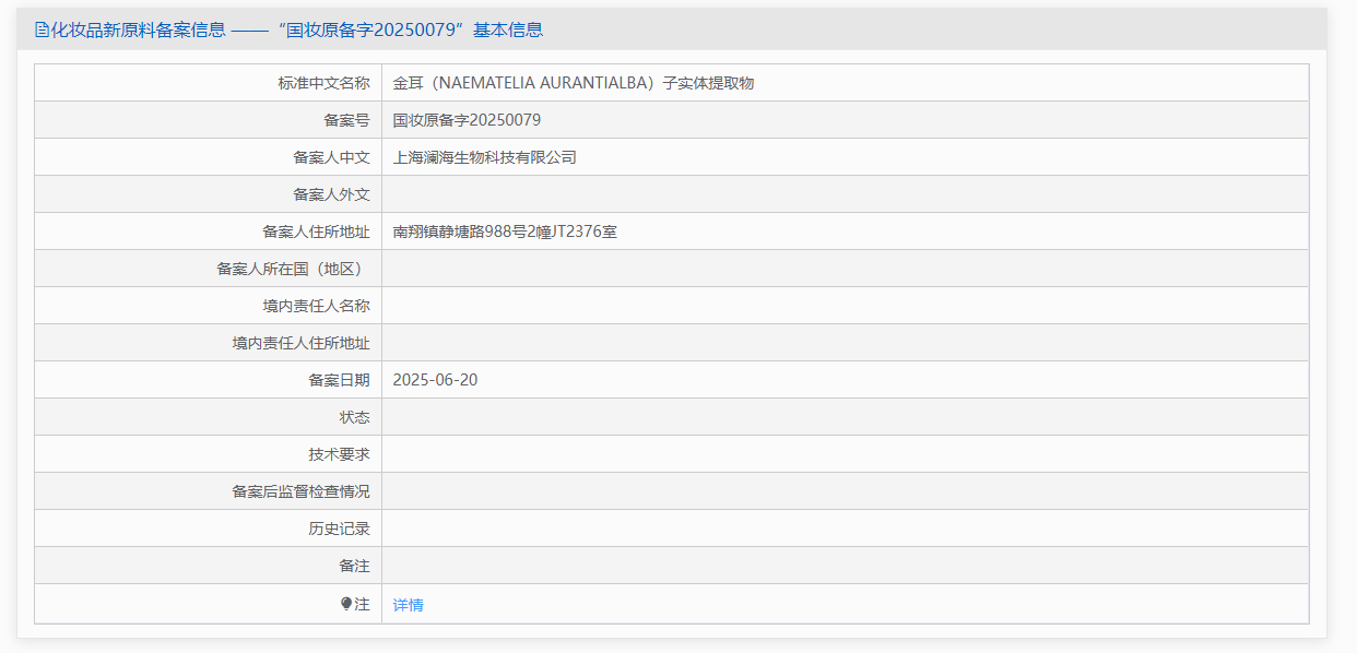 2025/2/12 | 金耳(NAEMATELIA AURANTIALBA)子实体提取物 | 国妆原备字20250015 | 深圳杉海创新技术有限公司 | 境内 |