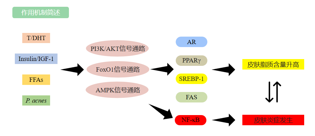 - 皮脂腺调控异常:痤疮的发展与皮脂分泌增加、皮脂溢出异常密不可分。皮脂能够为某些细菌提供生长条件,导致毛囊内环境变化。