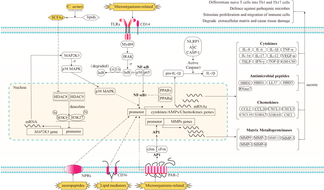 3.细菌感染与炎症反应:原称为痤疮丙酸杆菌(Propionibacterium acnes)的C.acnes,是正常人及痤疮患者皮肤上的一种主要共生细菌。痤疮的发生与C.acnes的系统发育失衡相关,皮肤微生物多样性的减少及先天免疫反应的触发可能会引起痤疮的慢性炎症。此细菌释放的趋化因子能吸引多形核白细胞至炎症区域。这些细胞在局部被激活,导致炎症细胞因子如TNF-α、IL-1β、IL-6和IL-8的产生。