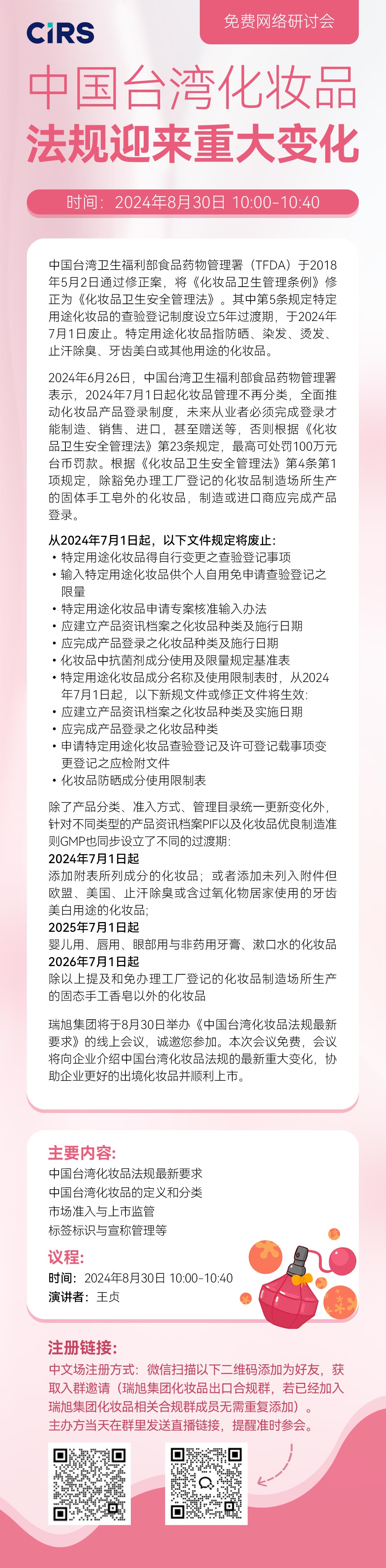 瑞旭集团将于8月30日举办《中国台湾化妆品法规最新要求》的线上会议,诚邀您参加。本次会议免费,会议将向企业介绍中国台湾化妆品法规的最新重大变化,协助企业更好的出境化妆品并顺利上市。