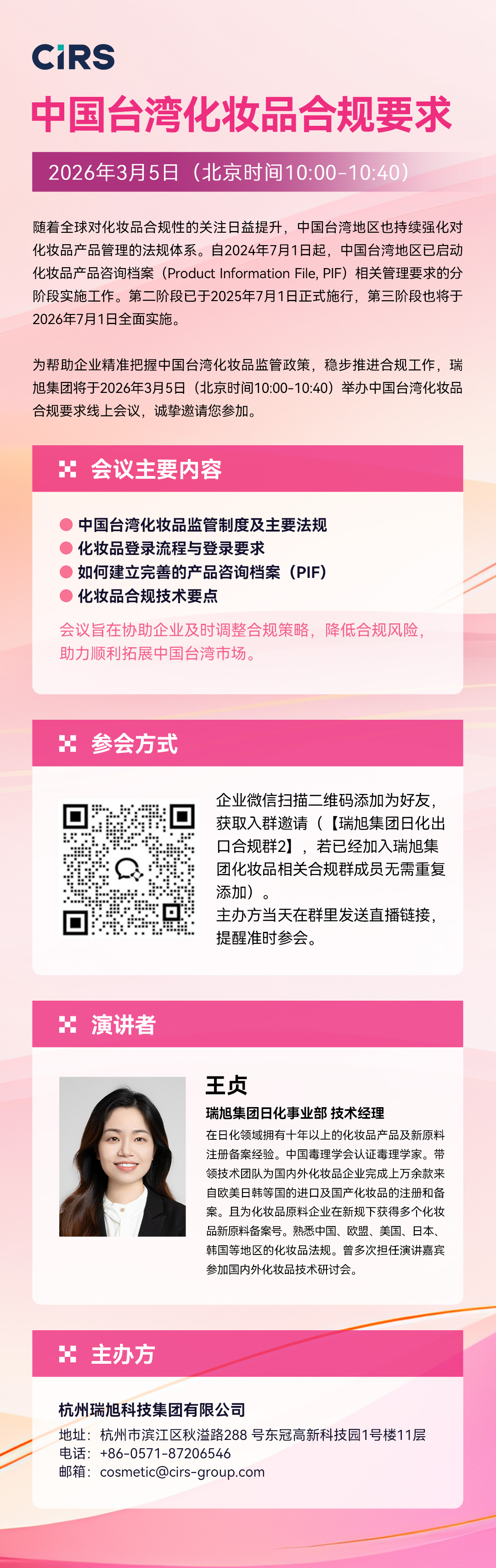 为帮助企业精准把握中国台湾化妆品监管政策,稳步推进合规工作,瑞旭集团将于2026年3月5日(北京时间10:00-10:40)举办中国台湾化妆品合规要求线上会议,诚挚邀请您参加。