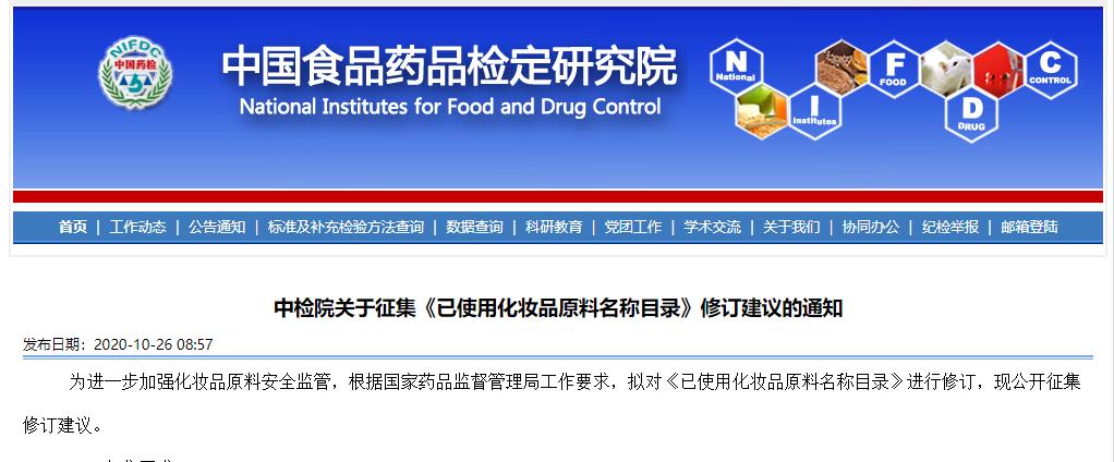 中检院发布关于征集《已使用化妆品原料名称目录》修订建议的通知