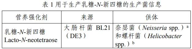 食品营养强化剂乳糖-N-新四糖该物质的质量规格要求按照国家卫生健康委员会2023年第8 号公告执行(附录 D 用于生产乳糖-N-新四糖的生产菌信息除外),该营养强化剂新品种的生产菌信息见下表。