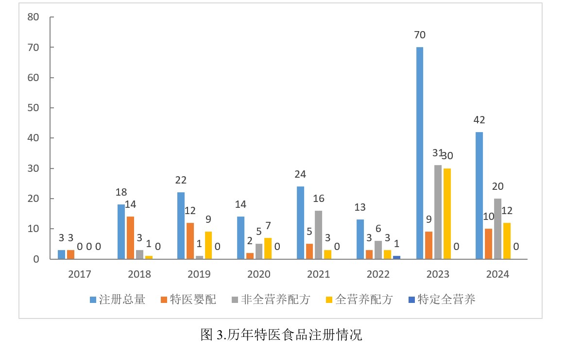 自2017年第一款特医婴配产品注册成功后,特医食品注册大门正式打开。由图3可知,特医婴配呈现高开低走的趋势,其注册主要集中于2018年和2019年,非全营养配方的注册则集中于2021和2023年。2022年总注册量较少,但注册产品类型增多,且新增了首款特定全营养配方食品。2023年新增了首款增稠组件,注册类型主要集中于全营养和非全营养产品,其占比高达87%。相比2022年注册量,2023年呈现爆发式增长。2024年前三个季度已新增获批42款产品,由此可见2024年的产品获批势头强劲,且已有3款特定全营养配方食品和1款氨基酸代谢障碍配方食品公示纳入优先审评审批程序。