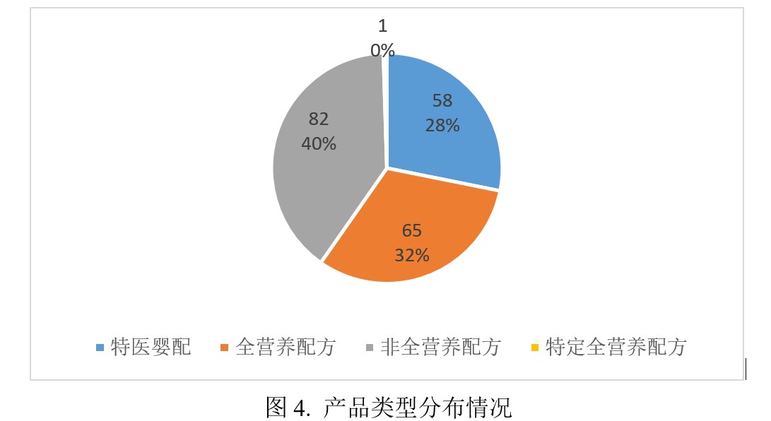 从产品类型来看,如下图所示,已获批产品中有58款为特殊医学用途婴儿配方食品,占到了总数的28%,包括5款乳蛋白深度水解配方或氨基酸配方、11款乳蛋白部分水解配方、15款无乳糖或低乳糖配方、1款氨基酸代谢障碍配方、20款早产/低出生体重婴儿配方、6款营养补充剂;82款为非全营养配方食品,包括26款蛋白质组件、2款脂肪组件、20款碳水化合物组件、24款电解质配方、4款增稠组件、4款流质配方、2款氨基酸代谢障碍配方(1岁以上),占总数的40%;65款为全营养配方食品,占总数的32%,包括11款全营养配方食品(1-10岁)和54款全营养配方食品(10岁以上);特定全营养配方食品仅有1款,为速熠素特殊医学用途肿瘤全营养配方食品。