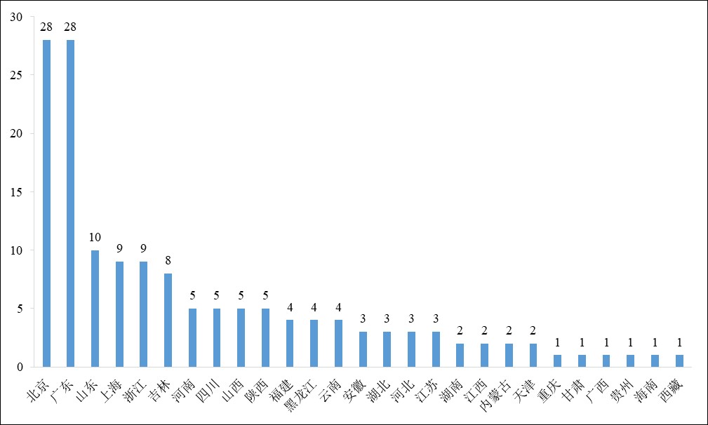 保健食品各地区(省、直辖市、自治区)注册情况千差万别,其中北京市和广东省获得注册批件的产品均为28款,获批数量并列第一,分别占保健食品注册总量的18.67%和18.67%(有3款保健食品未公布申报单位,不计入统计)。