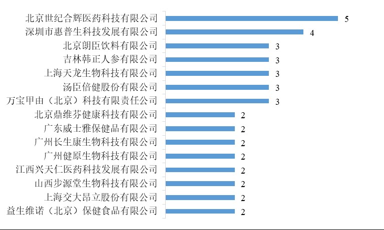 已注册保健食品分别来自125家保健食品企业,其中北京世纪合辉医药科技有限公司共有5款保健食品获得注册批件,获批数量最多;深圳市惠普生科技发展有限公司共有4款保健食品获得注册批件,获批数量位居次席(有3款保健食品未公布申报单位,不计入统计)。
