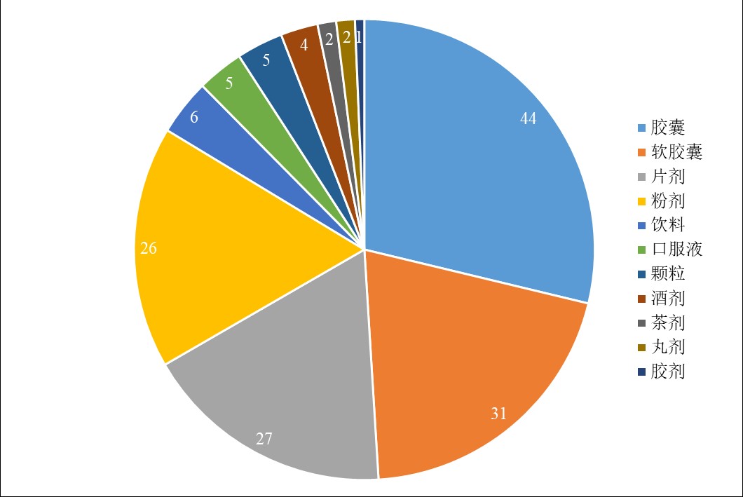 已注册保健食品的剂型包括胶囊、软胶囊、片剂、粉剂、饮料、口服液、颗粒、酒剂、茶剂、丸剂和胶剂。其中,胶囊类产品的获批数量最多,为44款,占保健食品注册总量的28.76%;此外,软胶囊、片剂和粉剂类产品的获批数量较多,分别为31款、27款和26款,分别占保健食品注册总量的20.26%、17.65%和16.99%。