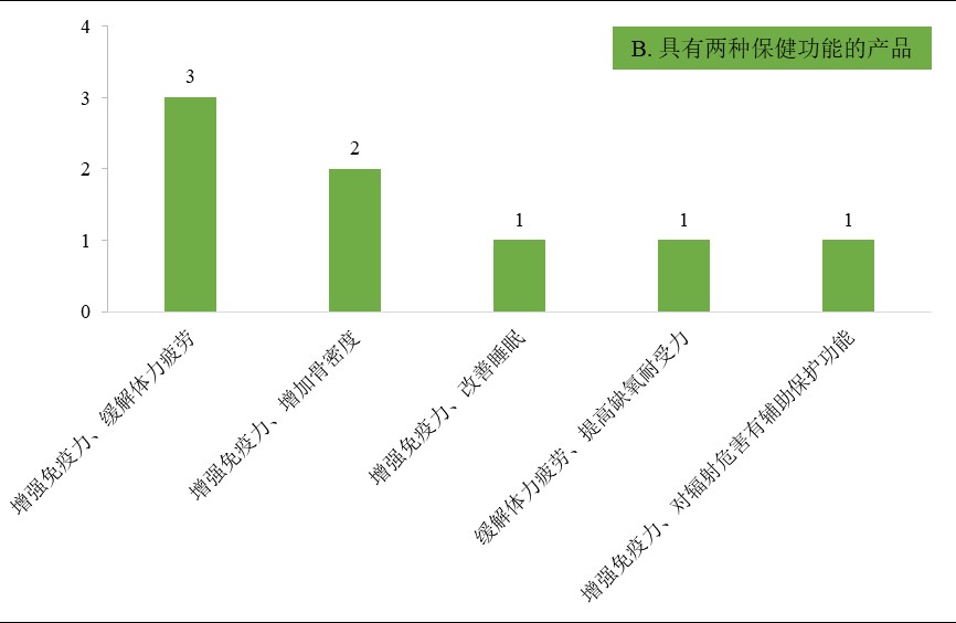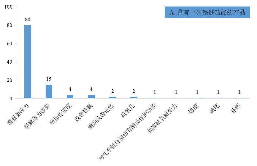 在已公布保健功能的120款产品中,具有一种保健功能的产品共112款,其中保健功能为增强免疫力的产品最多,达80款,占该类产品总量的71.43%;具有两种保健功能的产品共8款,其中保健功能为增强免疫力、缓解体力疲劳的产品最多,为3款,占该类产品总量的37.50%。