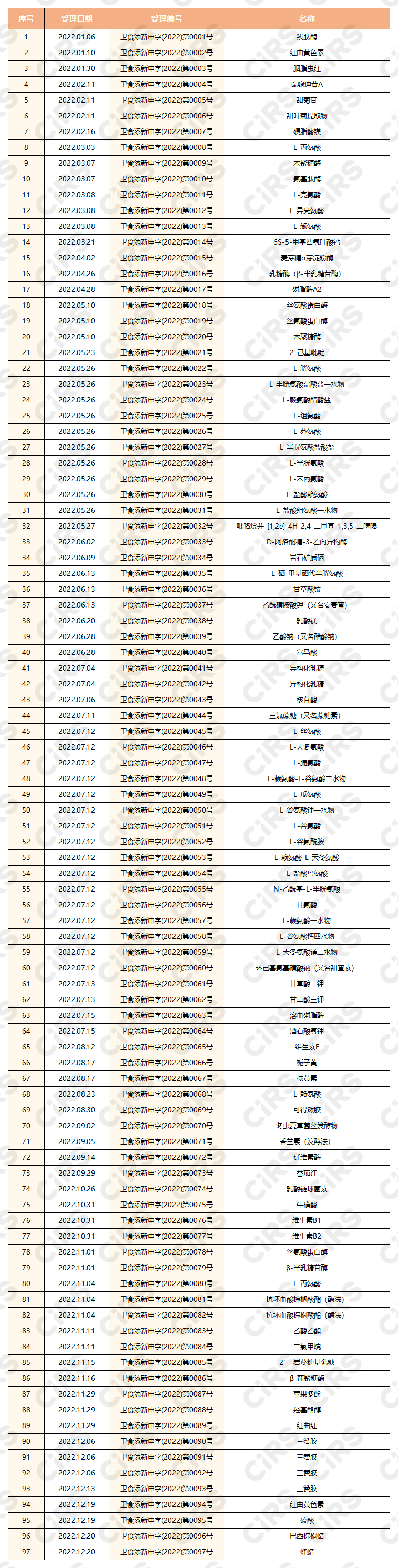 2022年,卫健委共受理97种食品添加剂(含扩大使用范围)新品种的申请,受理编号均以“卫食添新申字”体现,暂不能区分国产和进口产品。详细受理物质清单如下表。