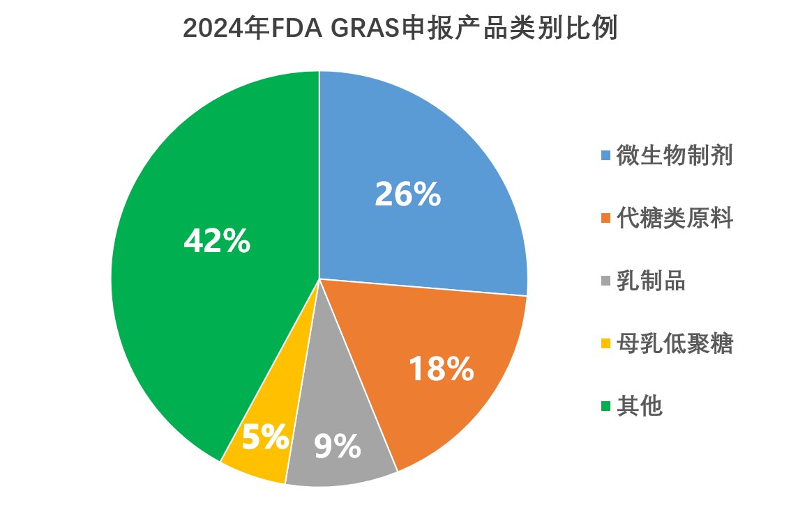 2024年,13款通过FDA GRAS认证的物质中5款微生物相关物质,3款代糖类原料,2款乳制品,2款蛋白,1款1-甲基环丙烯复合物。