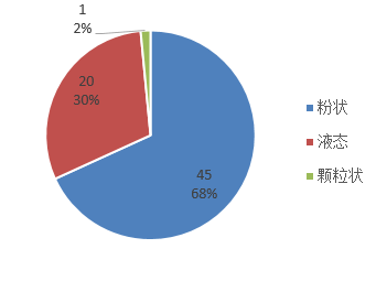 2024年获批的特医食品中,国产产品63款,占比95%;进口产品3款,占比5%,国产产品注册数量远超进口产品。产品剂型方面,粉状产品居多,共有45款,占比68%;液态产品20款,占比30%,另外还有1款产品剂型为颗粒状。