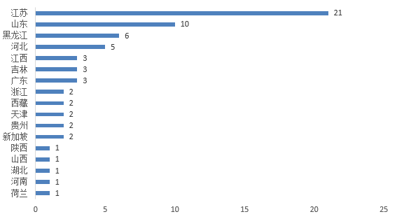 2024年注册批准的66款特医食品共来自17个省份地域,其中江苏、山东和黑龙江分别以21款、10款和6款的数量位列前三,占获批总数的32%、15%和9%。具体省份地域及数据见下图5。