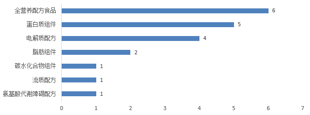 如下图3所示,2026年1季度注册的特医食品中,非全营养配方食品的数量最多,共13款,占获批总数的65%(其中蛋白质组件5款、电解质配方4款、脂肪组件2款、流质配方1款、碳水化合物组件1款);其次为全营养配方食品,共6款,占获批总数的30%;剩下1款是氨基酸代谢障碍配方食品。