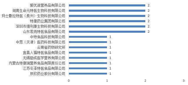 2026年1季度注册的20款特医食品共涉及14家申报单位。如下图6所示,爱优诺等6家企业分别获得2款特医食品批件,余下的8家企业均获得1款特医食品批件。