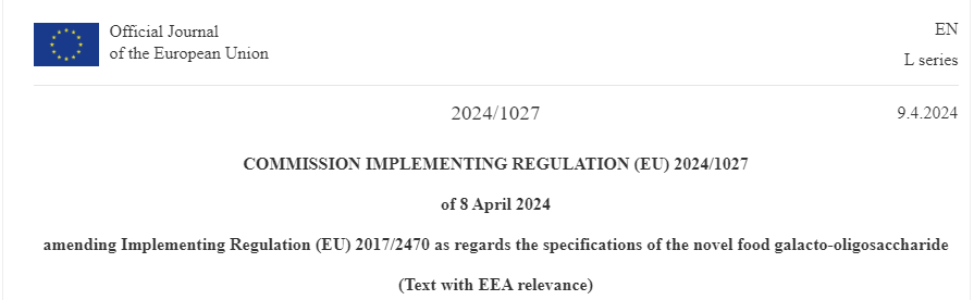 2024年4月9日,欧盟委员会发布条例(EU) 2024/1027,修订新型食品低聚半乳糖 (galacto-oligosaccharide)的质量规格,本条例自发布之日起第二十天生效。