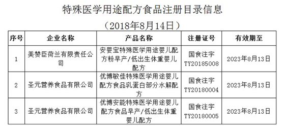 2018814日,国家市场监督管理总局批准2家企业共3个特殊医学用途配方食品注册,2款为国产产品,1款为进口产品。具体产品信息如下表所示: