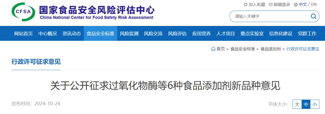 根据《食品添加剂新品种管理办法》和《食品添加剂新品种申报与受理规定》,食品添加剂新品种过氧化物酶和木聚糖酶、食品营养强化剂新品种3’-唾液酸乳糖钠盐和乳糖-N-新四糖、扩大使用范围的食品添加剂氧化镁和过氧化氢的申请,其安全性和工艺必要性已通过专家评审委员会技术审查(具体情况见附件),现公开征求意见。请于2024年11月24日前将相关意见反馈至我中心邮箱(zqyj@cfsa.net.cn),逾期将视为无意见。