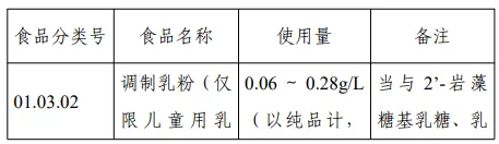 质量规格要求:乳糖-N-新四糖的使用范围、使用量及质量规格要求按照国家卫生健康委员会 2023 年第8 号公告执行(附录C用于生产乳糖-N-新四糖的生产菌信息除外)。
