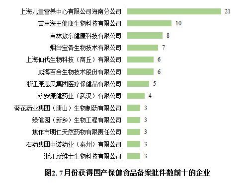 按备案人来看,7月共有33家企业获得国产保健食品备案凭证。其中,上海儿童营养中心有限公司海南分公司拿到21个批件,获批数量最多。