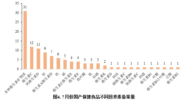 按营养素来看,获得备案凭证的国产保健食品中,补充多种维生素矿物质的产品最多,占7月获批总量的27.93%。补充单一营养素的产品中,补充维生素C的产品居多。补充两种营养素的产品中,补充钙和维生素D的产品居多。
