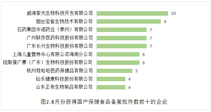按备案人来看,8月共有36家企业获得国产保健食品备案凭证。其中,威海紫光生物科技开发有限公司拿到10个批件,获批数量最多。