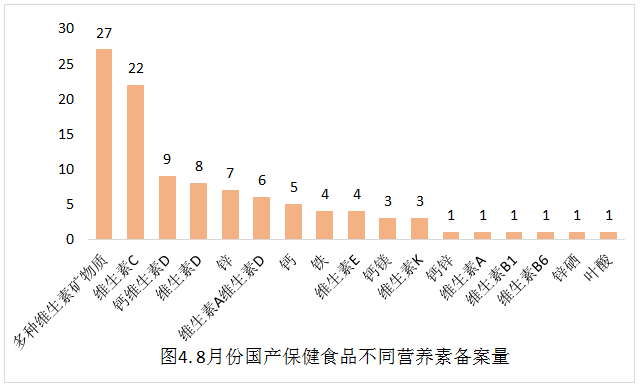 按营养素来看,获得备案凭证的国产保健食品中,补充多种维生素矿物质的产品最多,占8月获批总量的25.96%。补充单一营养素的产品中,补充维生素C的产品居多。补充两种营养素的产品中,补充钙和维生素D的产品居多。